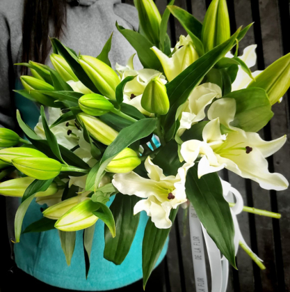 Свежий букет из лилий с добавлением берграсса